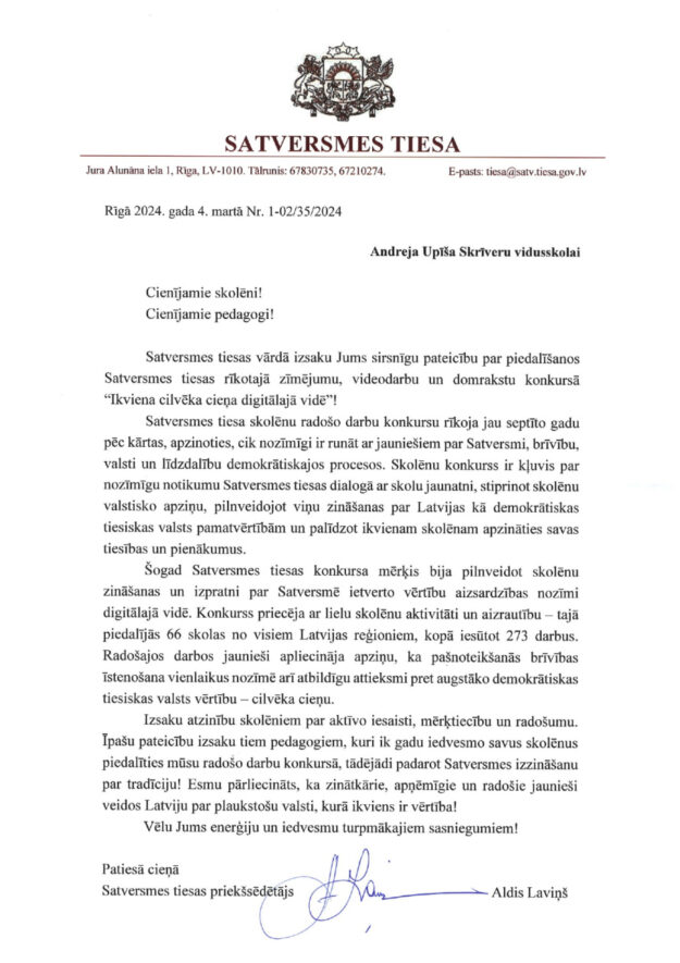 Krievu valodas valsts 25. olimpiādes novada (2. posma) kārtā piedalījās 11 skolēni no Andreja Upīša Skrīveru vidusskolas. 4 skolēni ieguvuši godalgotas vietas, bet ieguvēji noteikti ir visi, un uzkrātā pieredze noderēs turpmāk. No Aizkraukles novada uz valsts posma kārtu tika uzaicināts piedalīties 10.a klases skolēns Roberts Balodis. Valsts posma kārta notika klātienē š.g. 9. janvārī. Olimpiādes tēma bija “Ceļošana mums atklāj daudz, liek domāt un sapņot par daudzām lietām.” (D.Lihačevs). Skolēniem bija jāveic radošs rakstu darbs un jāiesaistās diskusijā.