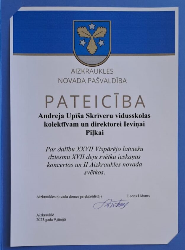 Andreja Upīša Skrīveru vidusskola saņēmusi pateicības rakstu par skolēnu sagatavošanu sekmīgām mācībām augstskolā.