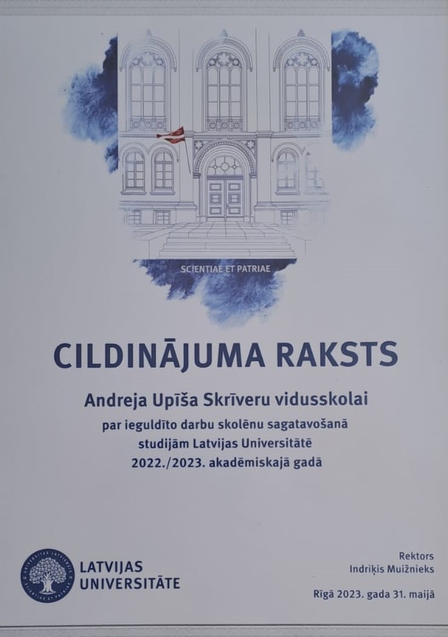 Andreja Upīša Skrīveru vidusskola saņēmusi pateicības rakstu par skolēnu sagatavošanu sekmīgām mācībām augstskolā.