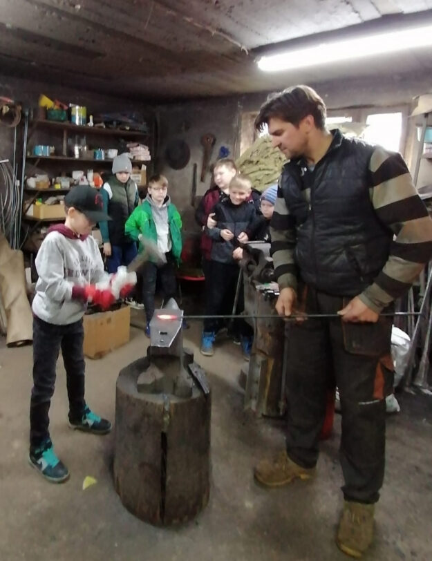 23.maijā trešo un ceturto klašu audzēkņi atsevišķās grupās apciemoja kalēju Aivaru Grīnbergu. Pirms ienākšanas pie meistara aplūkojām viņa gatavotos skaistos pagalma vārtus. Darbnīcā iepazināmies ar kalēja ēzi, kurā mūsdienās izmanto akmeņogles, un ar laktu, uz kuras gan meitenes, gan zēni izkala pa lielai naglai.