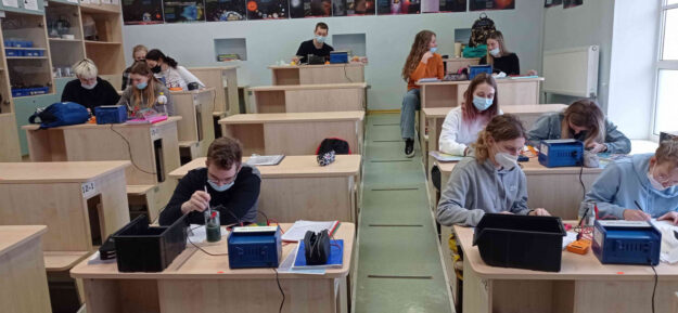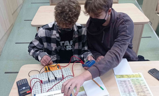 Arī devītās klases nesnauž un aizrautīgi veic laboratorijas darbus fizikas stundās.