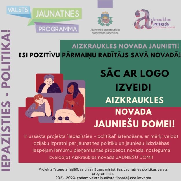 Jauniešu līdzdalība un dažādas iniciatīvas ir viens no galvenajiem jaunatnes politikas rādītājiem un rīkiem, kā jaunietis var izteikt savu viedokli par dažādiem procesiem un veidot sev apkārt tīkamu vidi, tāpēc aicinām jau tagad Aizkraukles novada jauniešus būt aktīviem un iesaistīties projekta īstenošanā un iesūtīt savas logo idejas!