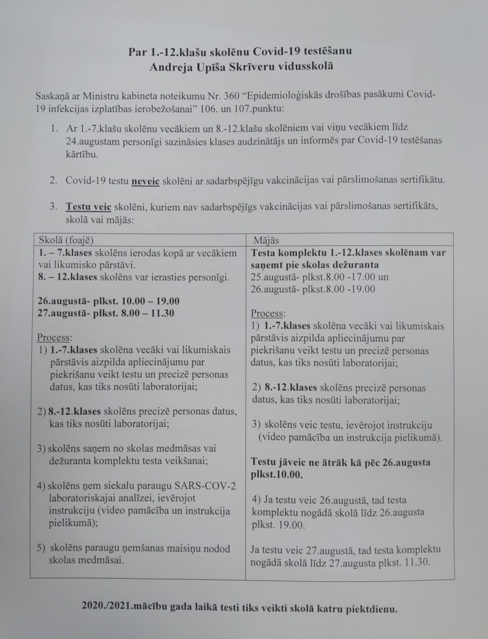 1. Ar 1.-7.klašu skolēnu vecākiem un 8.-12.klašu skolēniem vai viņu vecākiem līdz 24.augustam personīgi sazināsies klases audzinātājs un informēs par Covid-19 testēšanas kārtību.