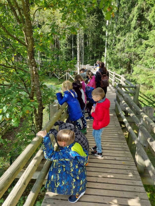 Apskatījām divus lāču puikas, meitenīte Ilzīte bija paslēpusies un gatavojās ziemai. Redzējām arī caunu, bet sesks bija ielīdis mājiņā sildīties. Mežacūkām ļoti patika dzīvoties zem koka saknēm un, spriežot pēc teritorijas, arī rakt daudz bedru. Lūšu ģimenes voljerā starp krūmiem un kokiem saskatījām lūšu mammu ar trīs lūsēniem. Vērojām pūces un ūpjus, uzzinājām, cik lieli spārni ir šiem putniem. Ekskursijā kopā ar gidu mūs pavadīja parka kaķis. Izbaudījām saulaino laiku un piknikojām parka teritorijā. Kopā ar gidu nogājām aptuveni 5 km. Paldies mūsu gidei par interesanto stāstījumu un pacietību, atbildot uz bērnu uzdotajiem jautājumiem un “Latvijas skolas somai” par apmaksātiem ceļa izdevumiem.
