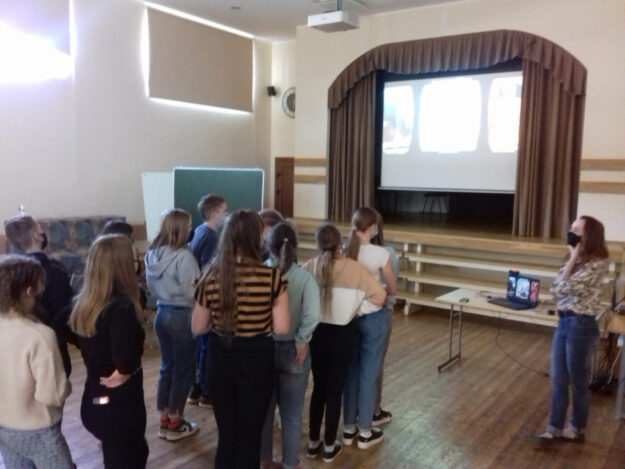 Klase sapulcējās lielajā zālē un caur Zoom uz lielā ekrāna saslēdzās ar Liepājas muzeju. Ekskursija sākās ar jautājumiem par Liepājas muzeju un turpinājās ar vadītājas Annas stāstījumu par vizuālās mākslas žanriem. Pēc stāstījuma iesaistīja arī skolēnus. Pirmajā uzdevumā uz ekrāna bija norādītas trīs gleznas un dažādi filmu žanri. Katram skolēnam bija jāizvēlas, viņuprāt, katram filmas žanram atbilstošākā glezna, jānostājas pretī . Daži arī paskaidroja, kādēļ viņi to izvēlējās.