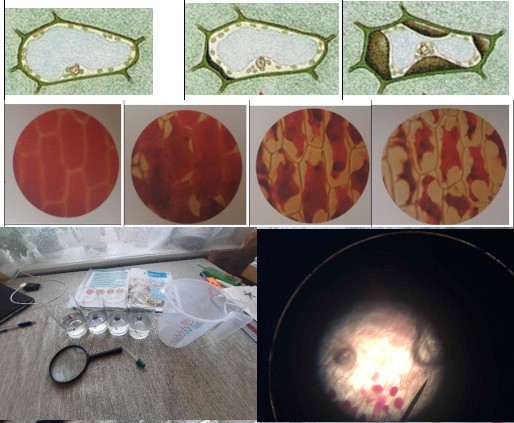 Attālinātajās mācībās 7. klašu skolēni patstāvīgi pētīja sāls šķīduma ietekmi uz sarkanā sīpola virsmiziņas šūnu iekšējo spiedienu.Tika pagatavoti sāls šķīdumi ar atšķirīgu koncentrāciju un tajos ievietota sīpola plēvīte. Attēla kreisajā pusē apakšā redzam Kārļa Jančenko darbu, labajā pusē- Kārļa Gusarova novērojumu mikroskopā.Savukārt, augšējā attēla daļā Ramona Paegle atradusi un darbā ievietojusi attēlu- zīmējumu par pārmaiņām šūnā, zem tā – Emīla Vanaga izvēlētais attēls. Ko tad varēja novērot? Ja sīpola virsmiziņu ievieto sāls šķīdumā, kurā sāls koncentrācija ir tāda pati kā šūnās, tad pārmaiņas nenotiek, bet, palielinoties sāls koncentrācijai, citoplazma zaudē ūdeni un kopā ar membrānu atraujas no šūnapvalka. Šis kopsavilkums varētu palīdzēt izprast to, ko ne visiem izdevās novērot.