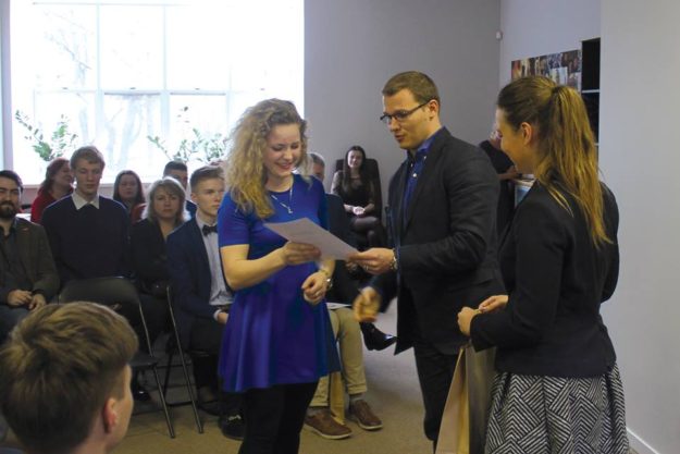 26. aprīlī 11. klašu skolēni – Ilva Lāce, Reinis Eiduks un Anastasija Meņšova – skolotājas Santas Krasovskas pavadībā devās uz Rīgu, Nacionālās Apvienības biroju, kur notika Saeimas deputāta Raivja Dzintara izsludinātā konkursa “ Aicini amatpersonu runāt latviski” laureātu apbalvošana. Konkursam gandrīz 100 jauniešu bija iesūtījuši vairāk nekā 90 darbus – plakātus, esejas, vēstules. Skrīverieši bija 28 apbalvoto skaitā. Katrs ieguva uzaicinājumu piedalīties nedēļu ilgā jauniešu vasaras nometnē, kā arī 200€ lielu naudas balvu. Paldies skolotājai Santai Krasovskai par ieguldīto darbu!