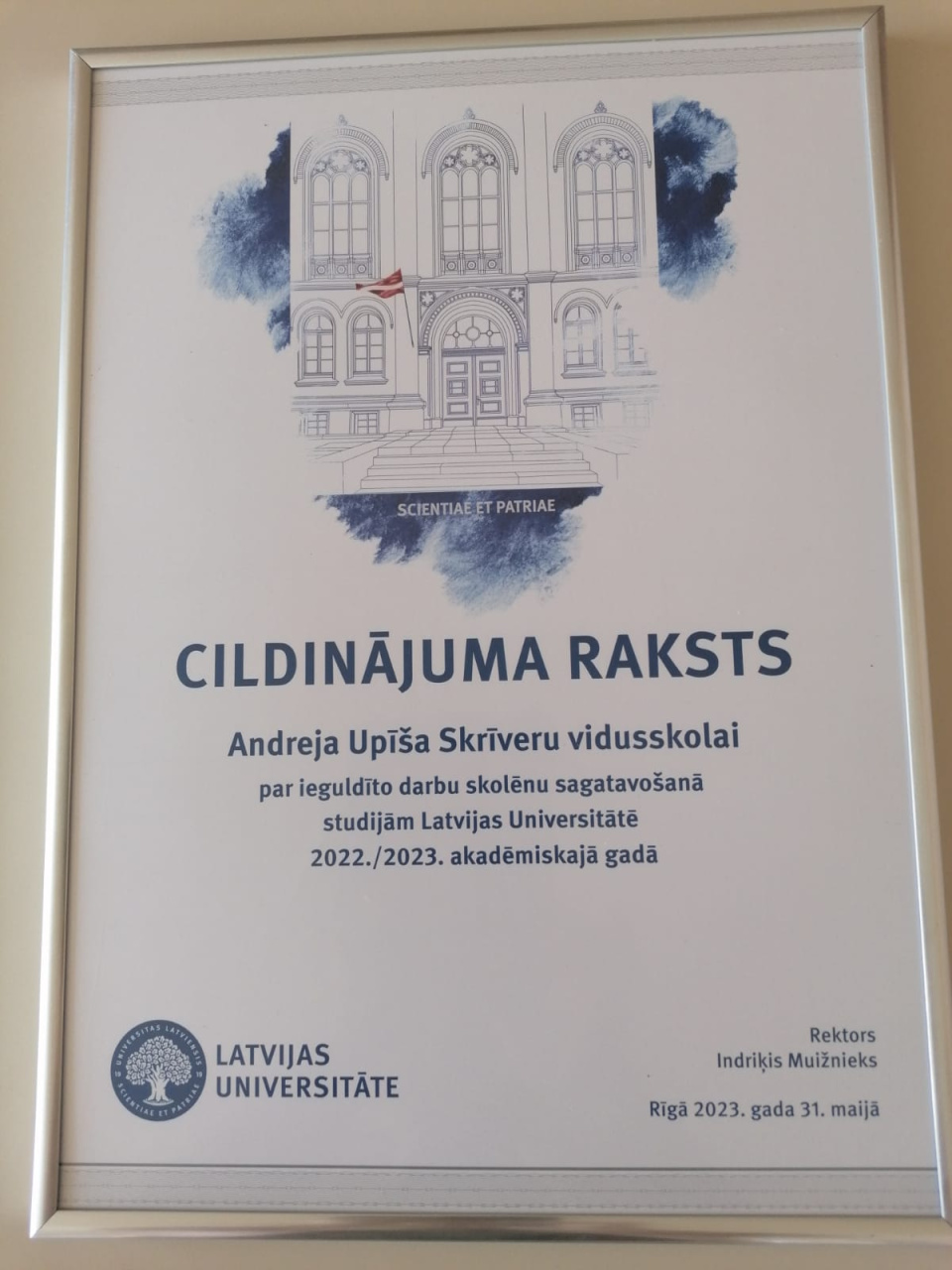 Andreja Upīša Skrīveru vidusskola saņēmusi pateicības rakstu par skolēnu sagatavošanu sekmīgām mācībām augstskolā.
